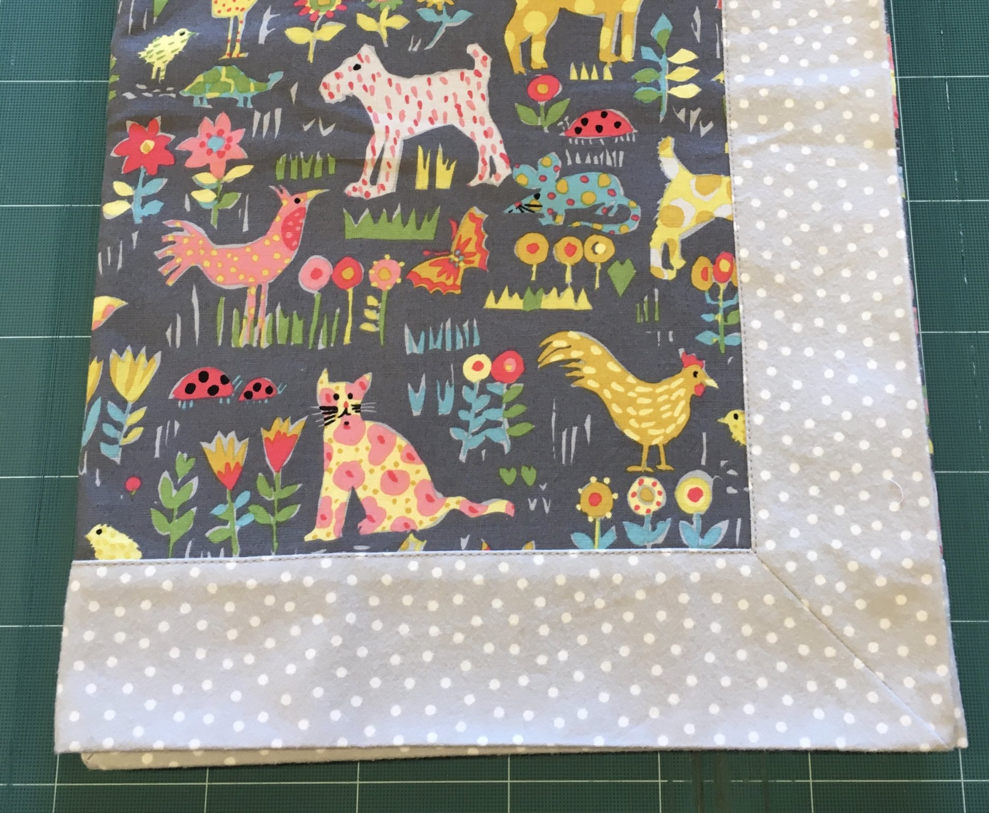 Choose your favorite flannel for the backing/ border, and co-ordinate another flannel or quilt weight cotton fabric for the inner fabric. The choice is yours. I don’t recommend minky for your first blanket.